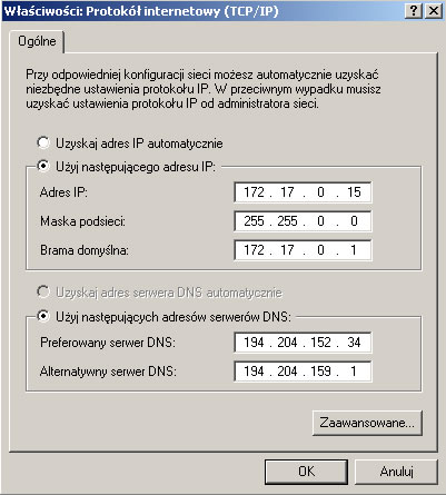 4.W oknie Właściwości: Protokół internetowy (TCP/IP) zaznaczyć opcje Użyj następującego adresu IP, i wpisać kolejno Adres IP, Maskę podsieci, Bramę domyślną oraz Serwer DNS przydzielone przez nas w umowie, a następnie zatwierdzić przyciskiem OK.